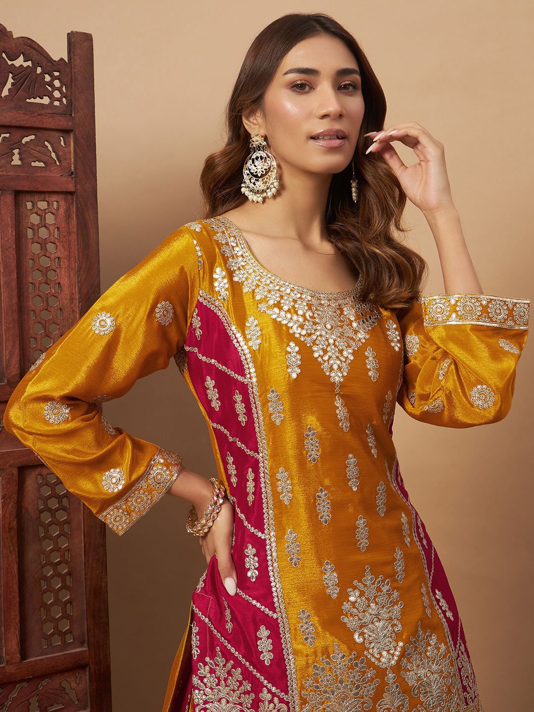 Yellow & Gold-Toned embroidered kurta , has a round neck, long Sleeves slip-on closure