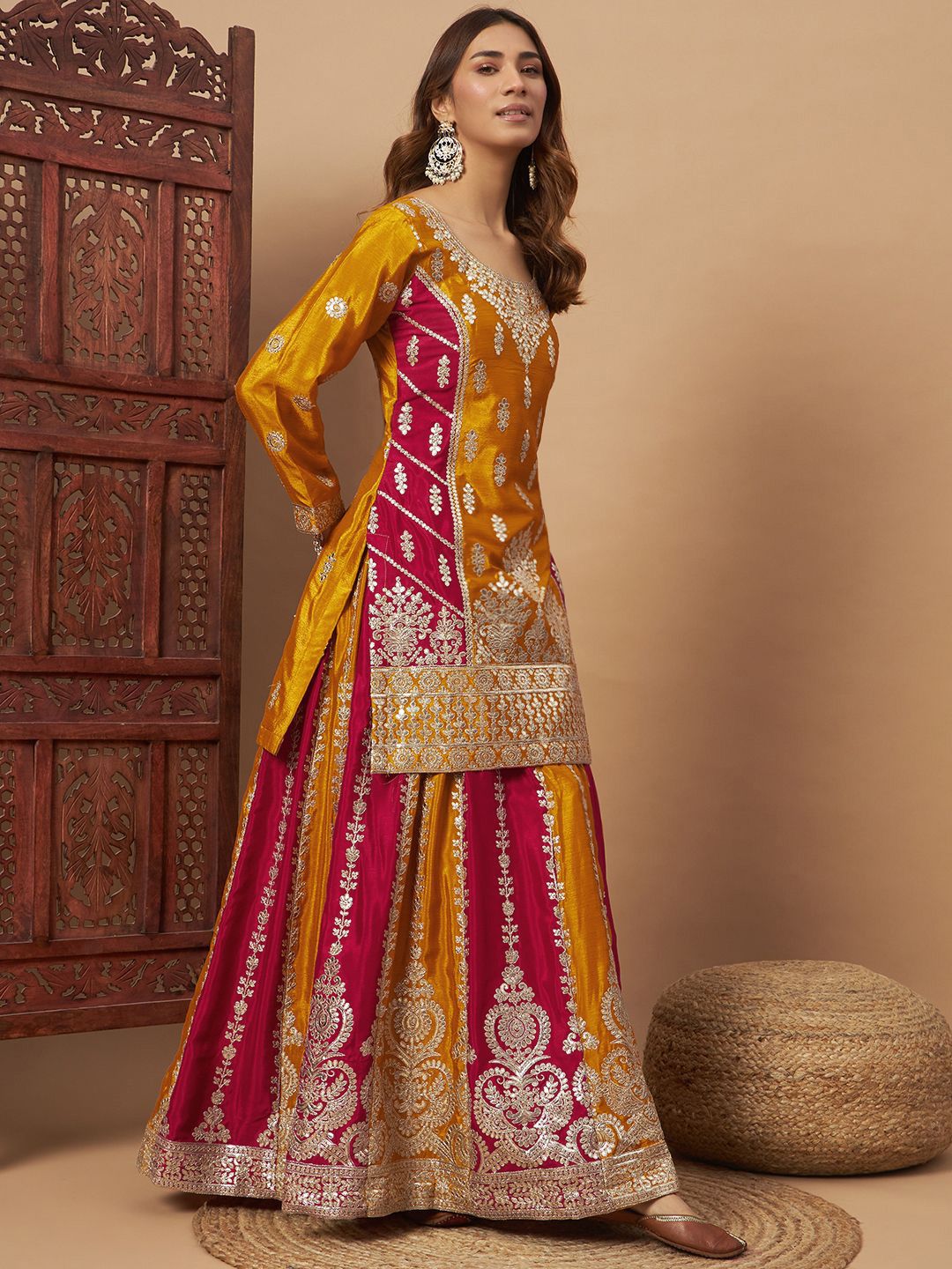This set consists of lehenga, kurta and dupatta
