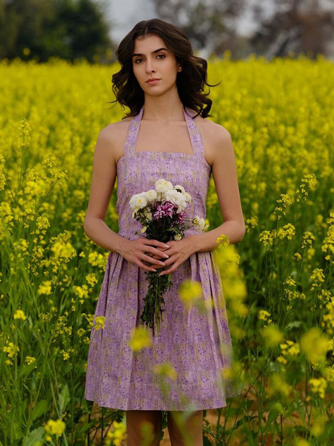 - Lavender floral printed fit & flare dress