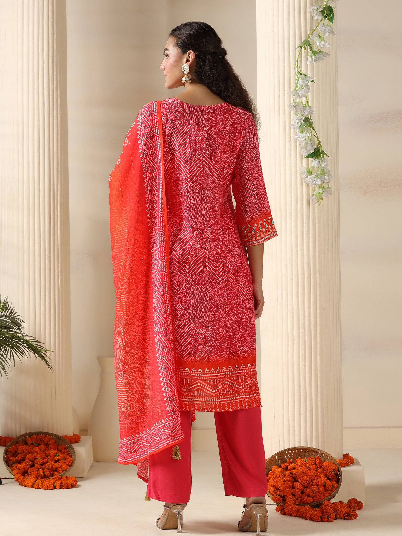 Women Chanderi Pink Bandhani Print embroidered Kurta Comfort Pant Dupatta