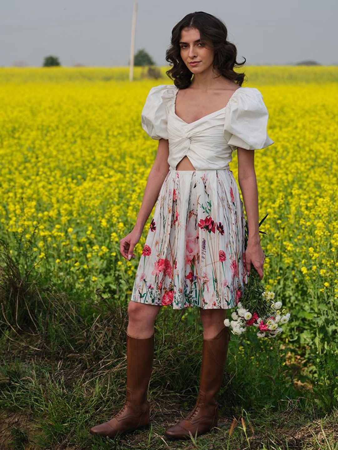 Women Floral Printed Puff Sleeve Cut-Outs Fit & Flare Dress